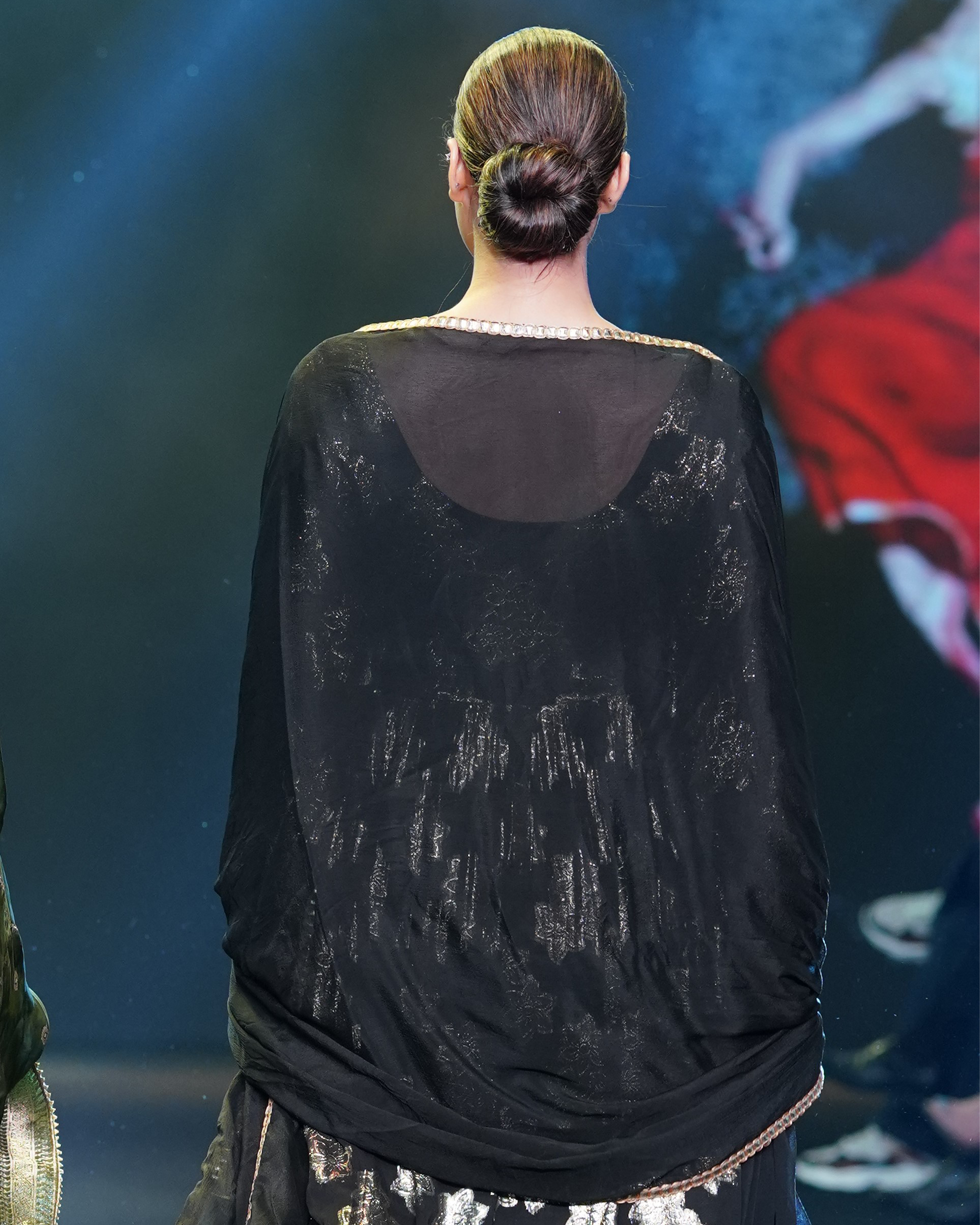 Elegant Black and Gold Anarkali Set in Lurex georgette with asymmetric and layered organza palazzo (sharara) beautifully paired with ruffled dupatta.
