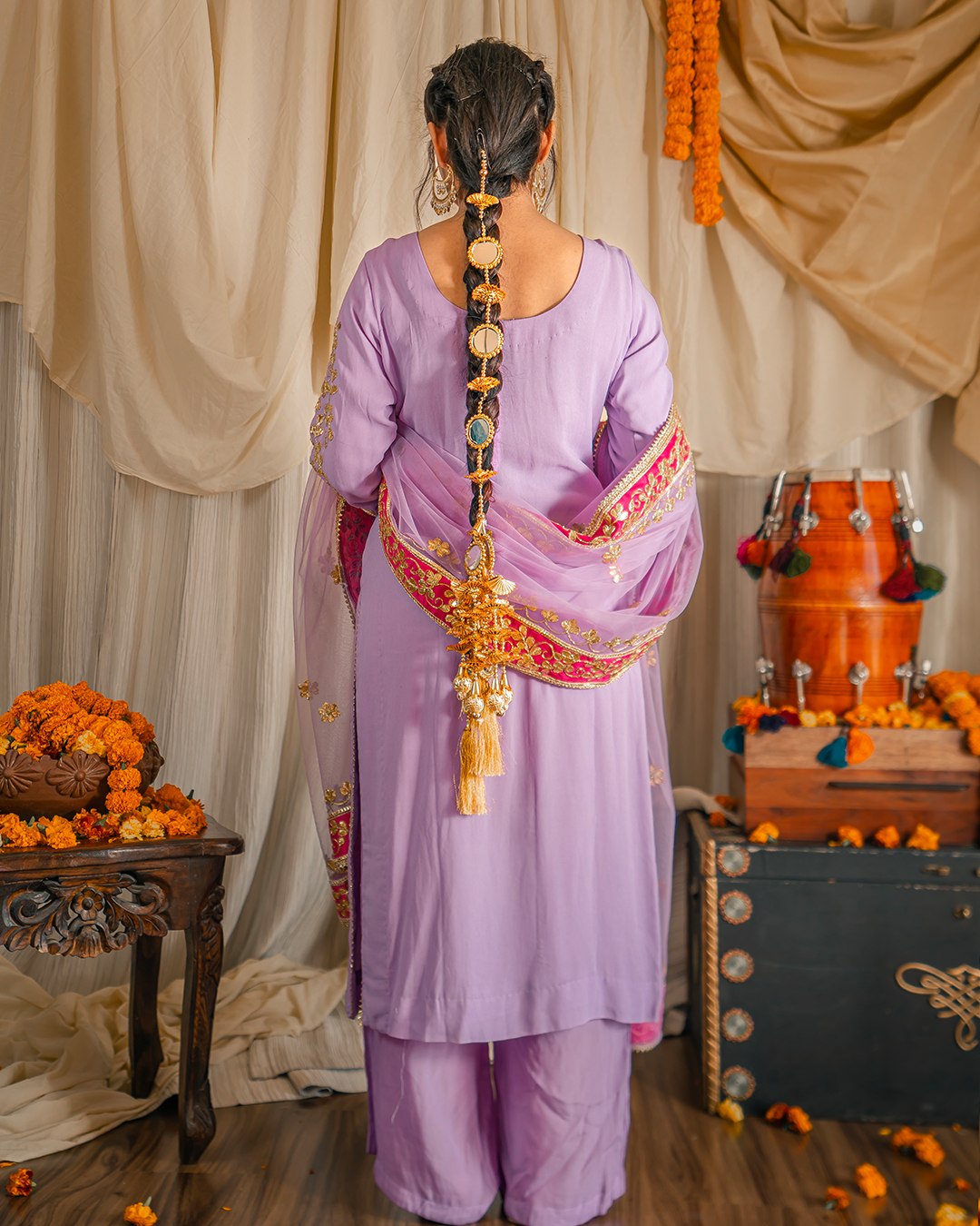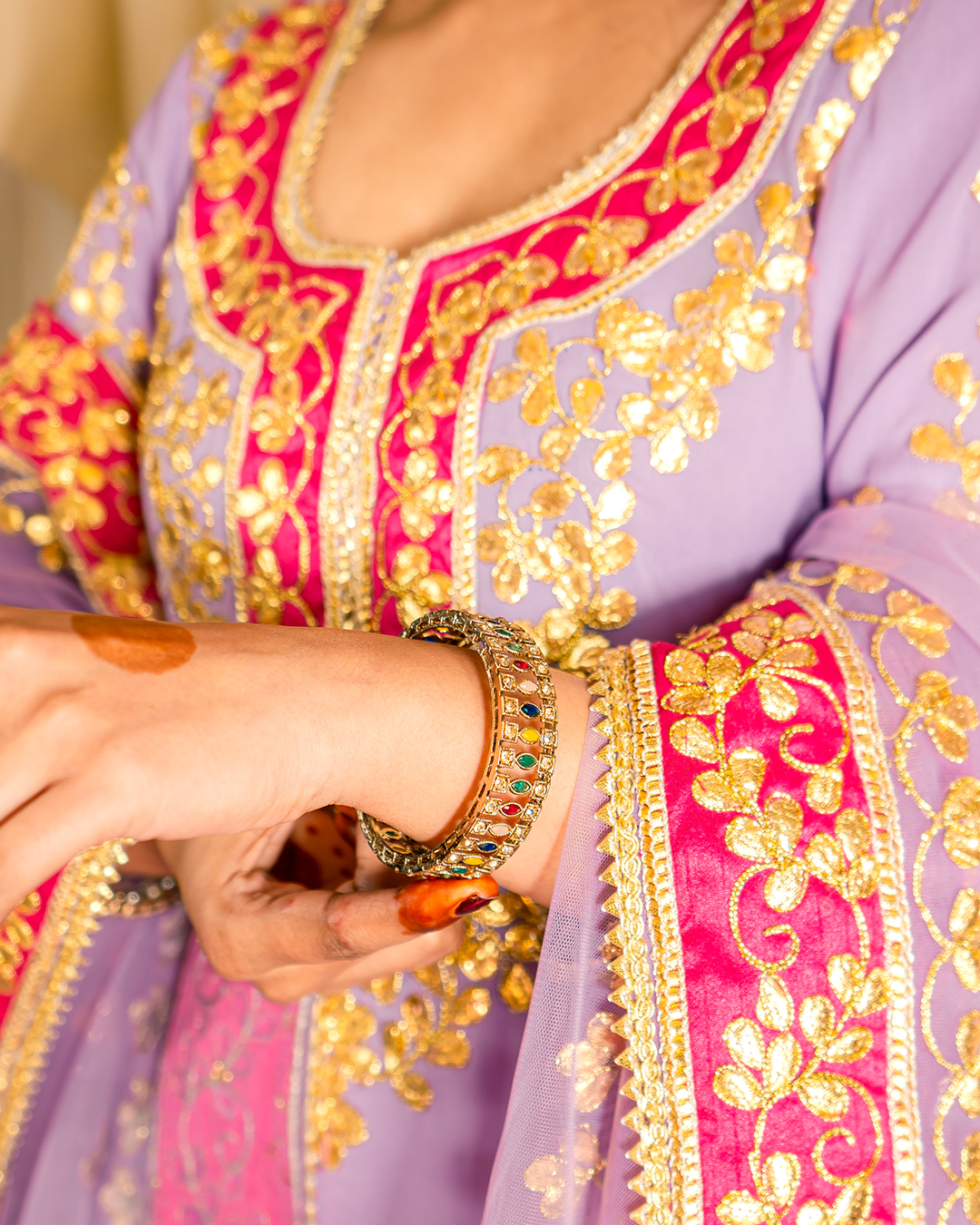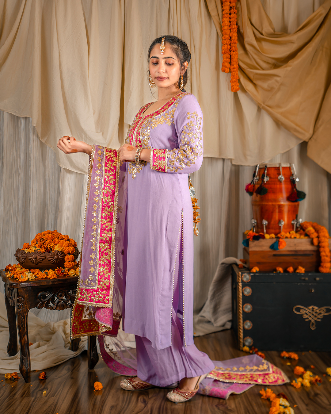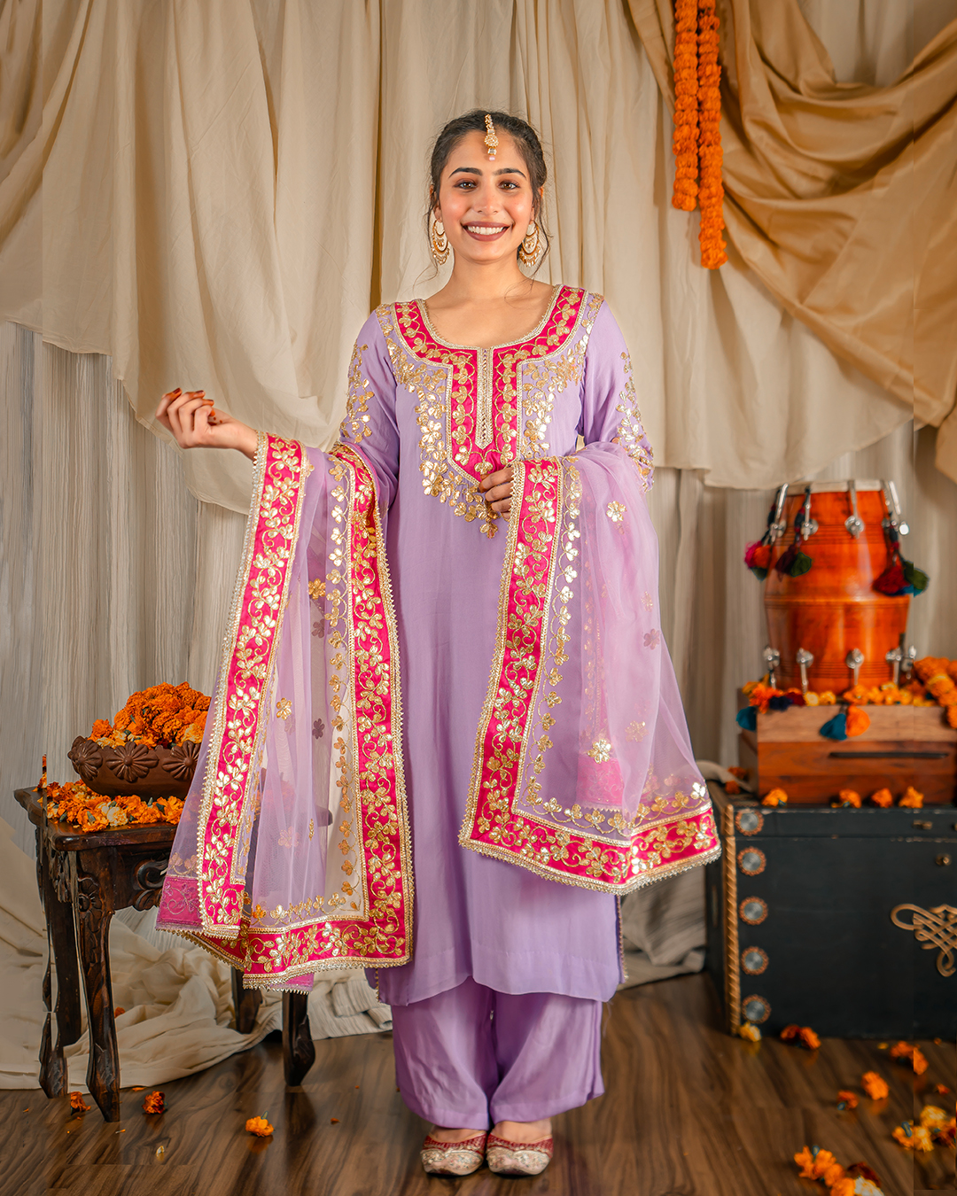 Our Signature pieces are made from high-quality materials, with each embroidery crafted by skilled artisans who value traditional craftsmanship over fast fashion. Lilac Kurta Set with hot pink borders including a Georgette Kurta with gota embroidery & heavy detailed neckline paired with crepe pants and net dupatta.
