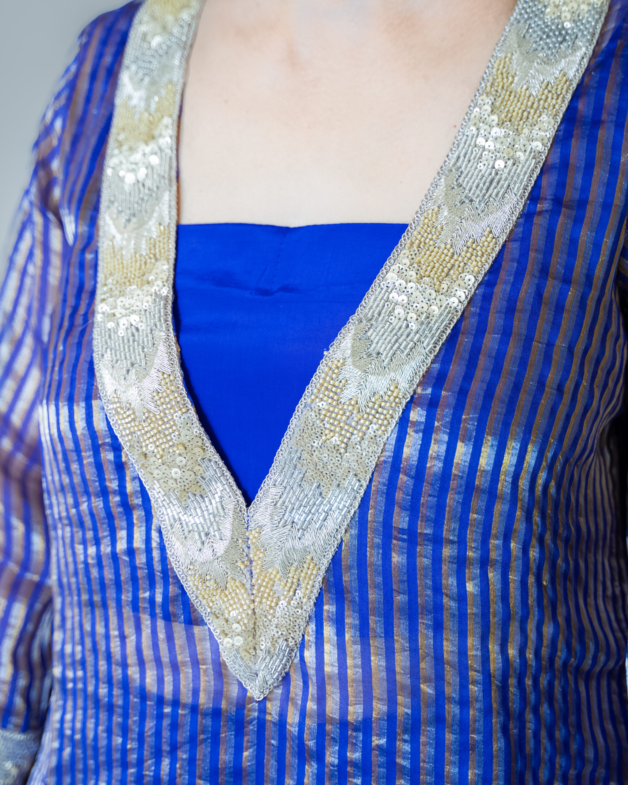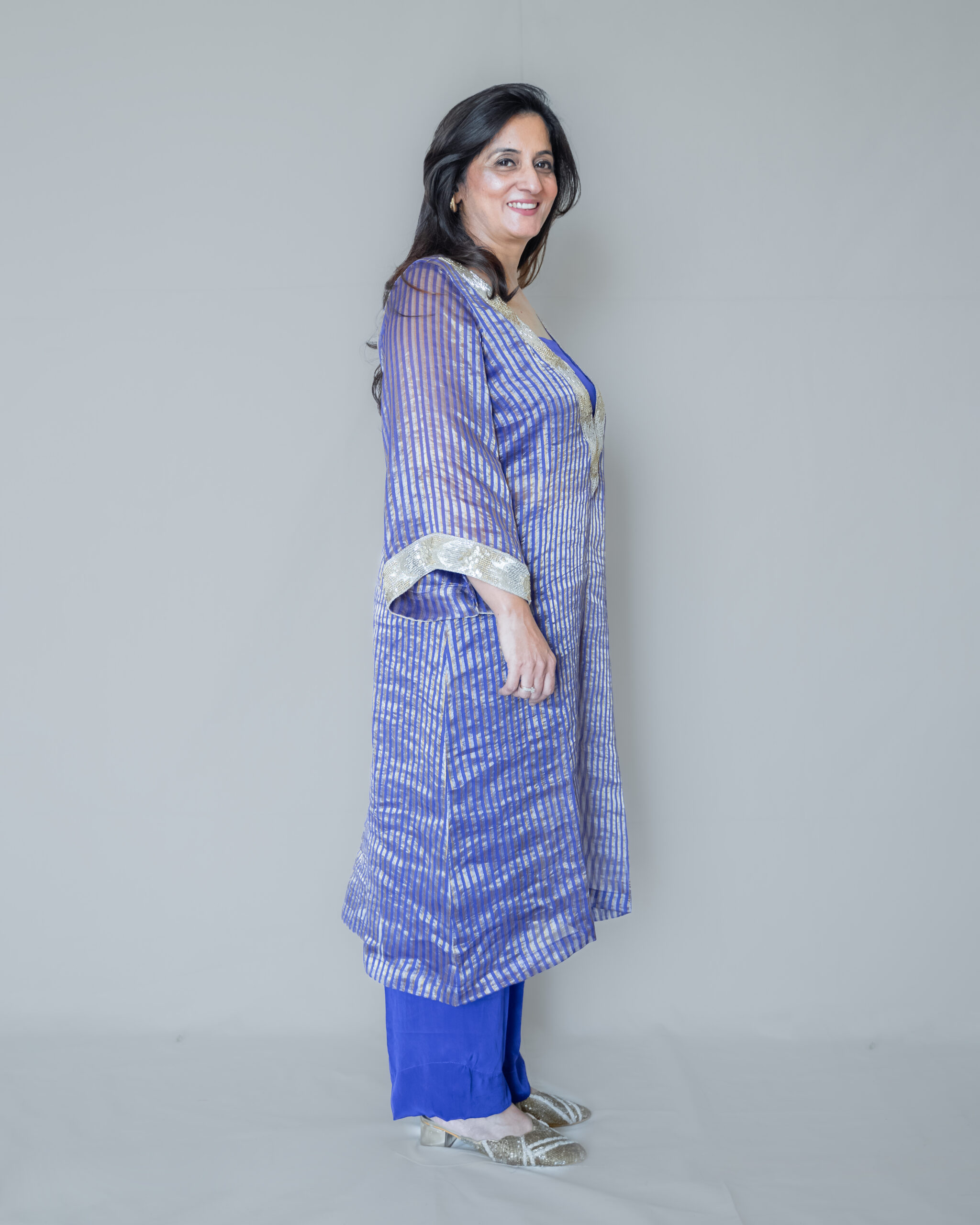 Our Indo-Western pieces are made from high-quality materials, with each embroidery crafted by skilled artisans who value traditional craftsmanship over fast fashion. Trending 3 piece co-ord set consists of One solid crop top, one solid palazzo pants in Indigo Purple paired with vibrant Pure Silk Tissue V-Neck Kurta with hand-embroidered Gold detailing on Neck and Sleeves.