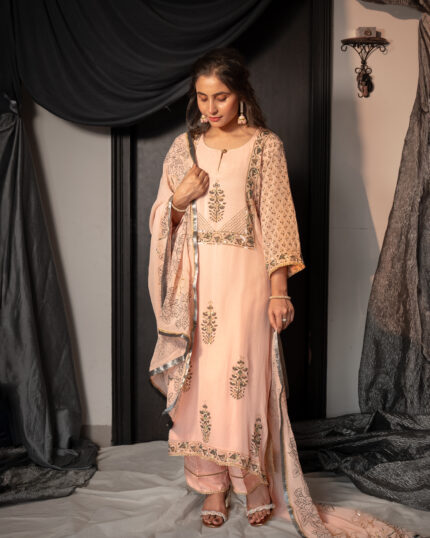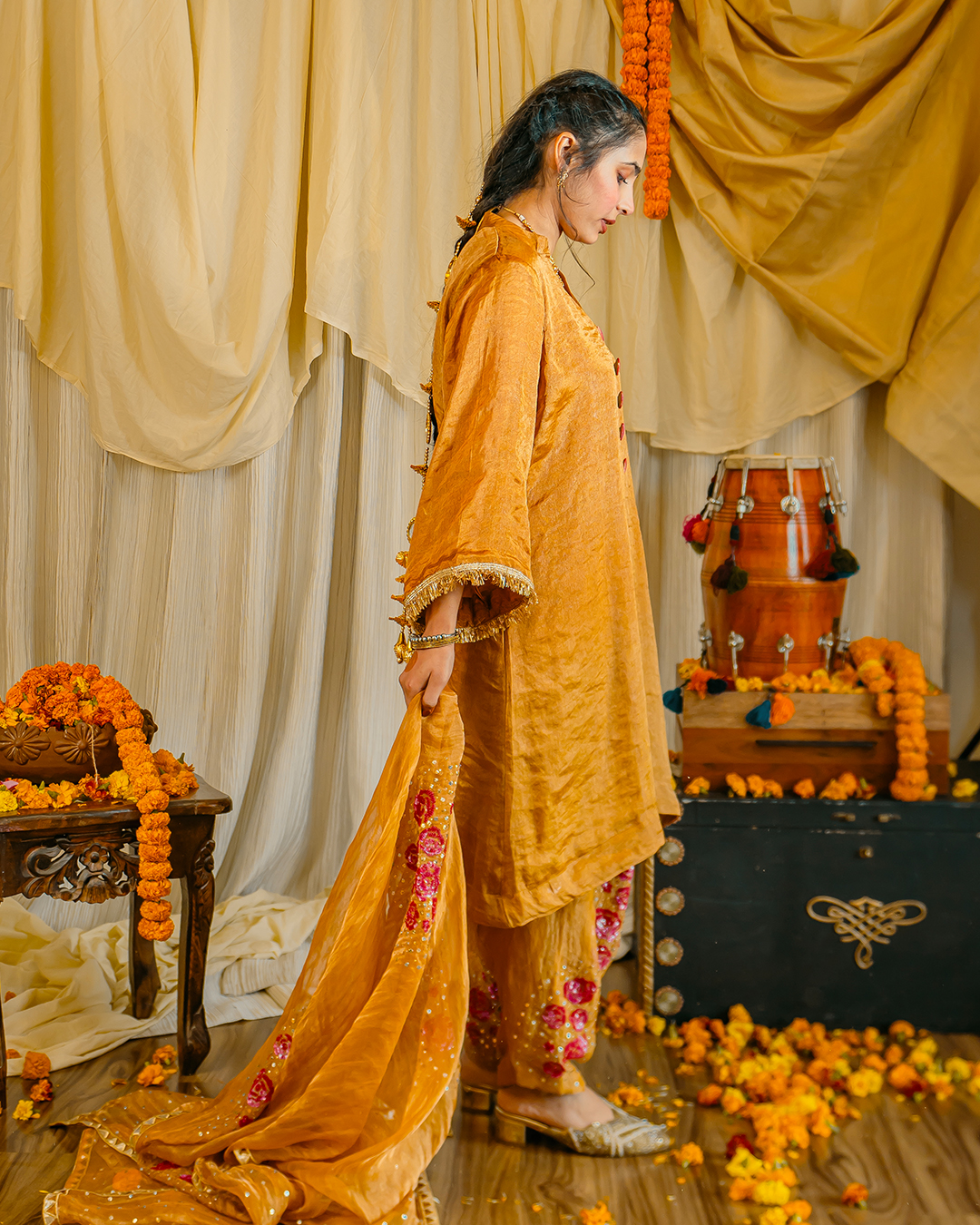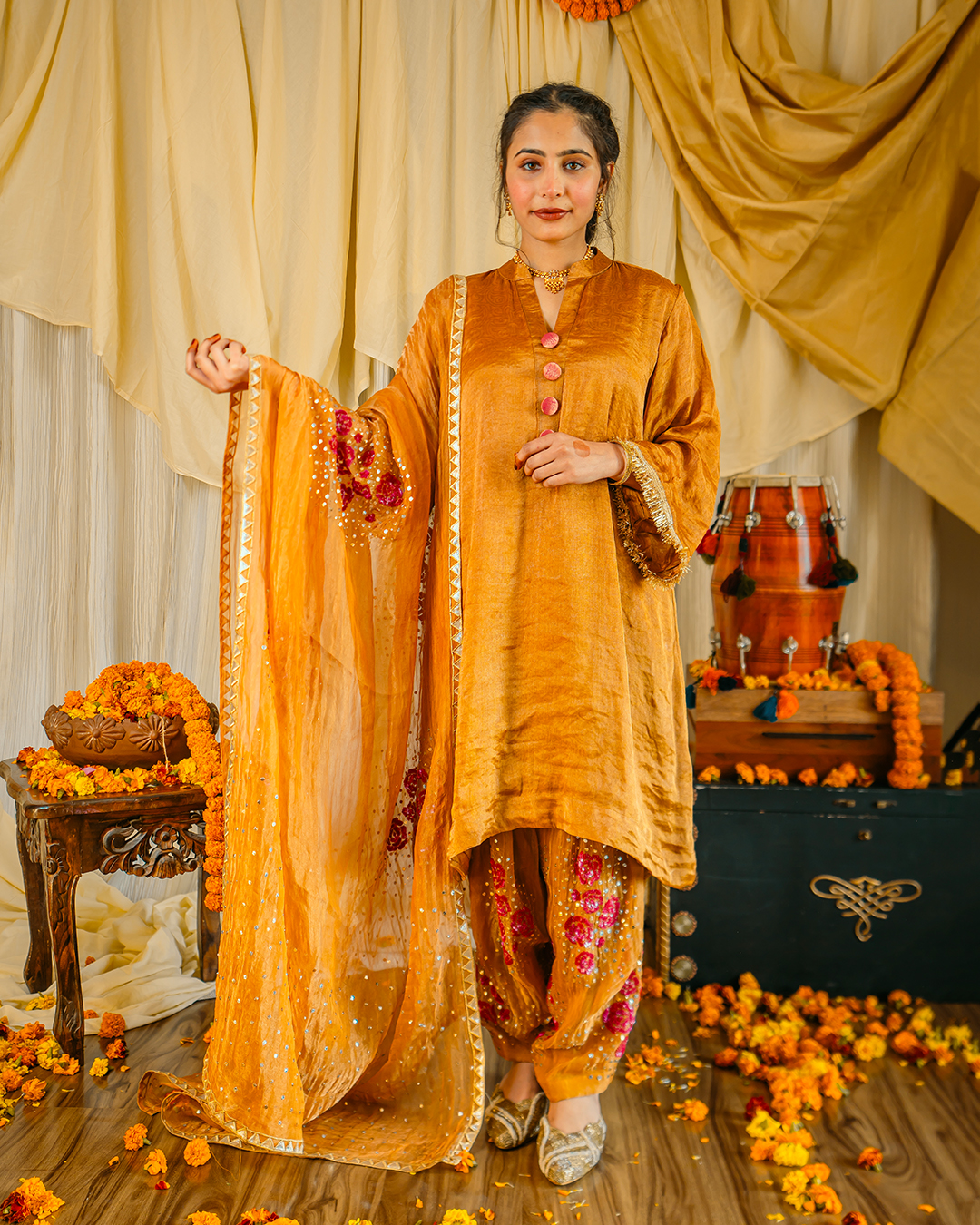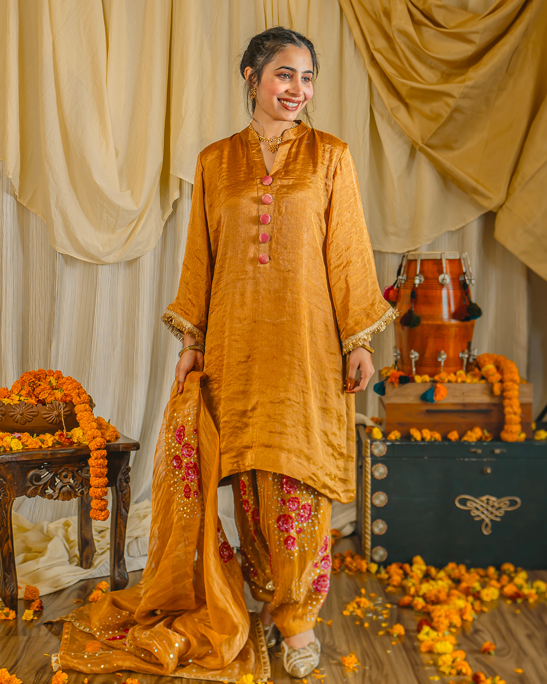 Our Signature pieces are made from high-quality materials, with each embroidery crafted by skilled artisans who value traditional craftsmanship over fast fashion. Zari Tissue handcrafted ensemble in warm rust includes a solid, gota detailed asymmetrical breezy kurta, paired with Salwar embellished with hand-embroidered Mukaish-work in Rose Gold & Silver accompanied by Hot Pink roses