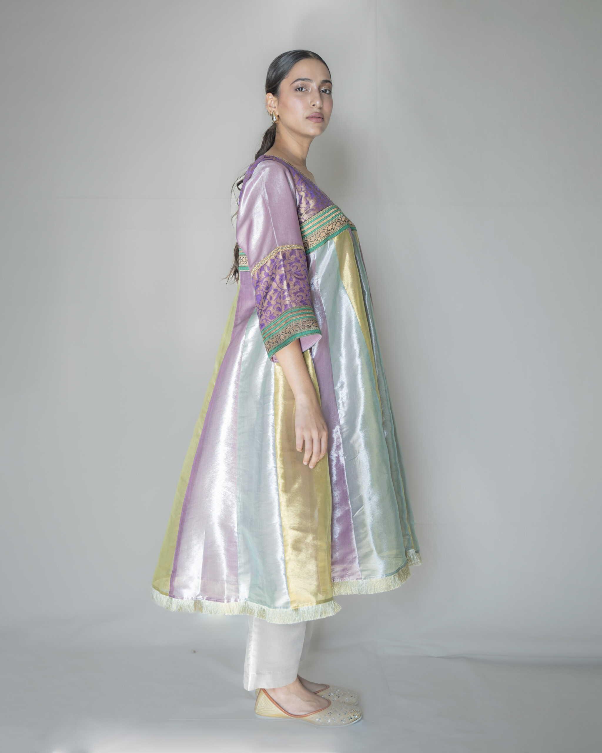 Our Indo-Western pieces are made from high-quality materials, with each embroidery crafted by skilled artisans who value traditional craftsmanship over fast fashion. Trending Multi-colored Anarkali Set in Tissue Zari fabric, the neckline and sleeves have been adorned with upcycled brocade, the Anarkali is detailed with gold borders and paired with Moon White Palazzo Pants.