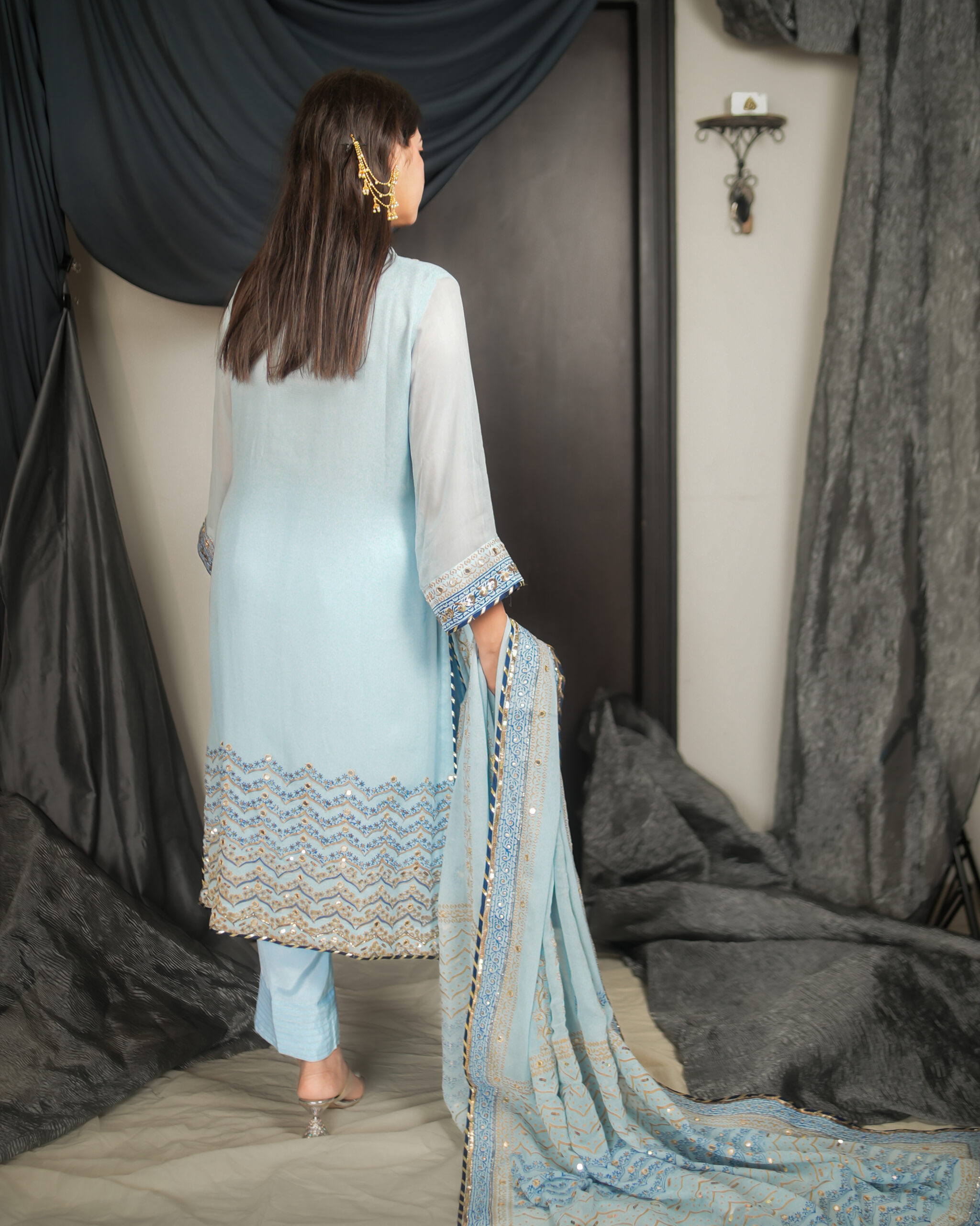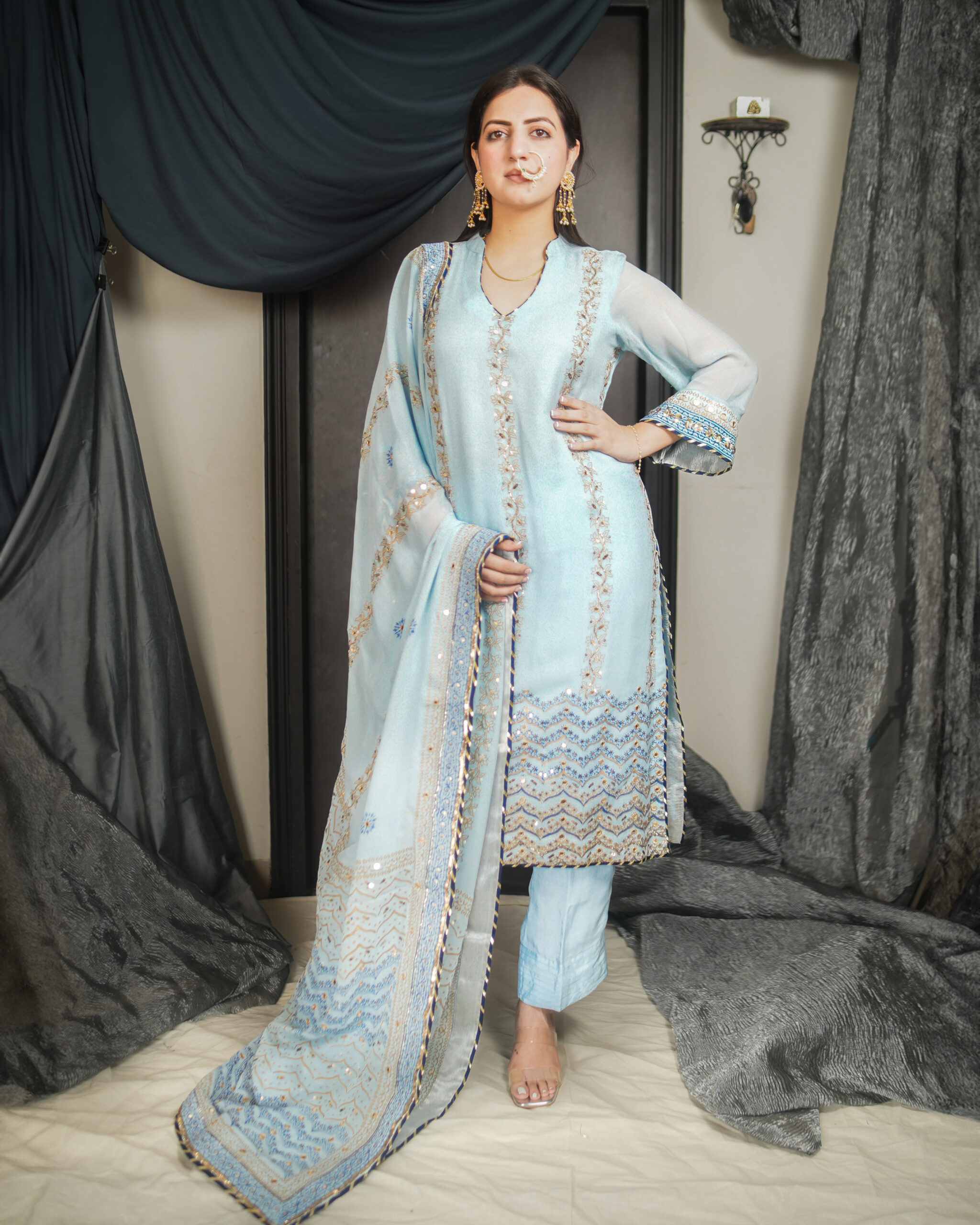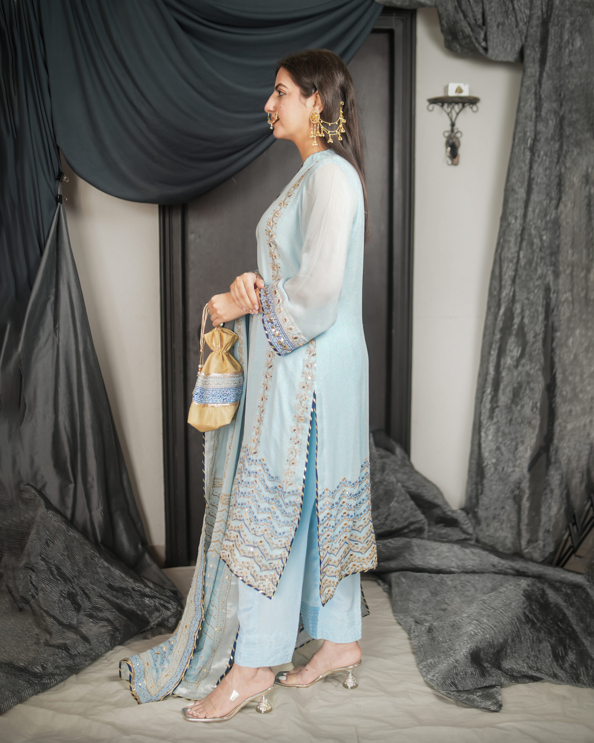 Sky Blue block printed Kurta highlighted with hand-embroidered sequins, mirrors and Jaipuri Gota lace