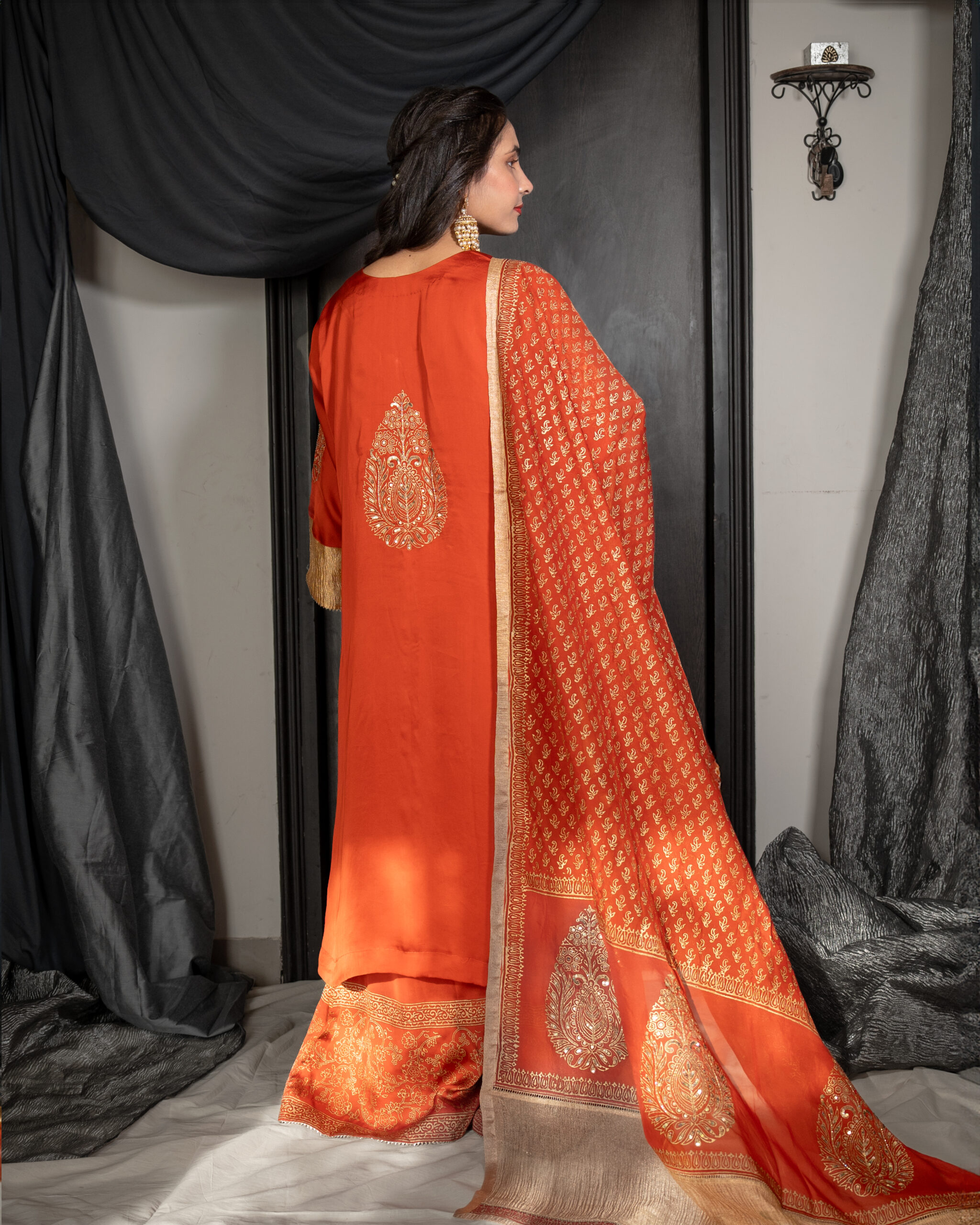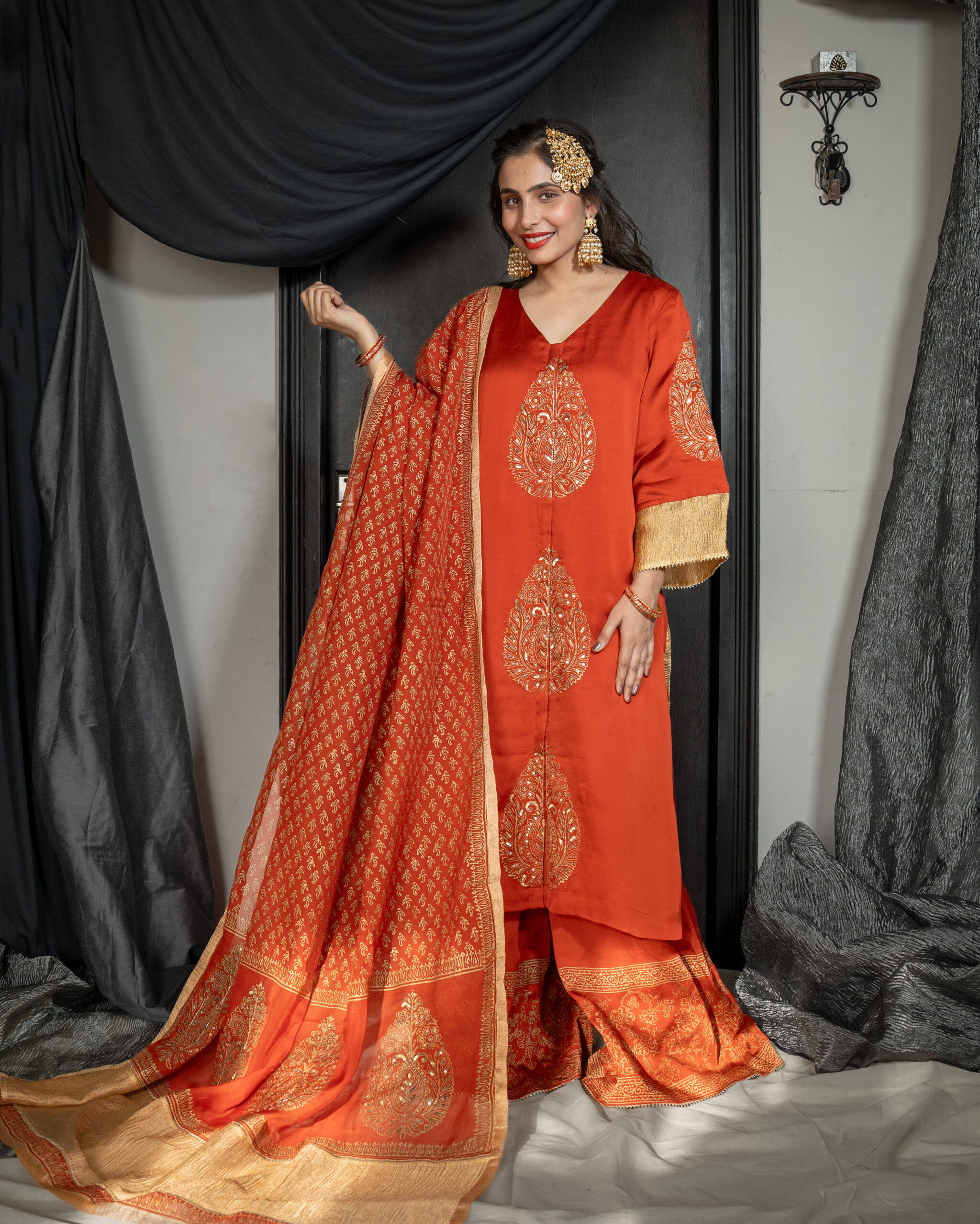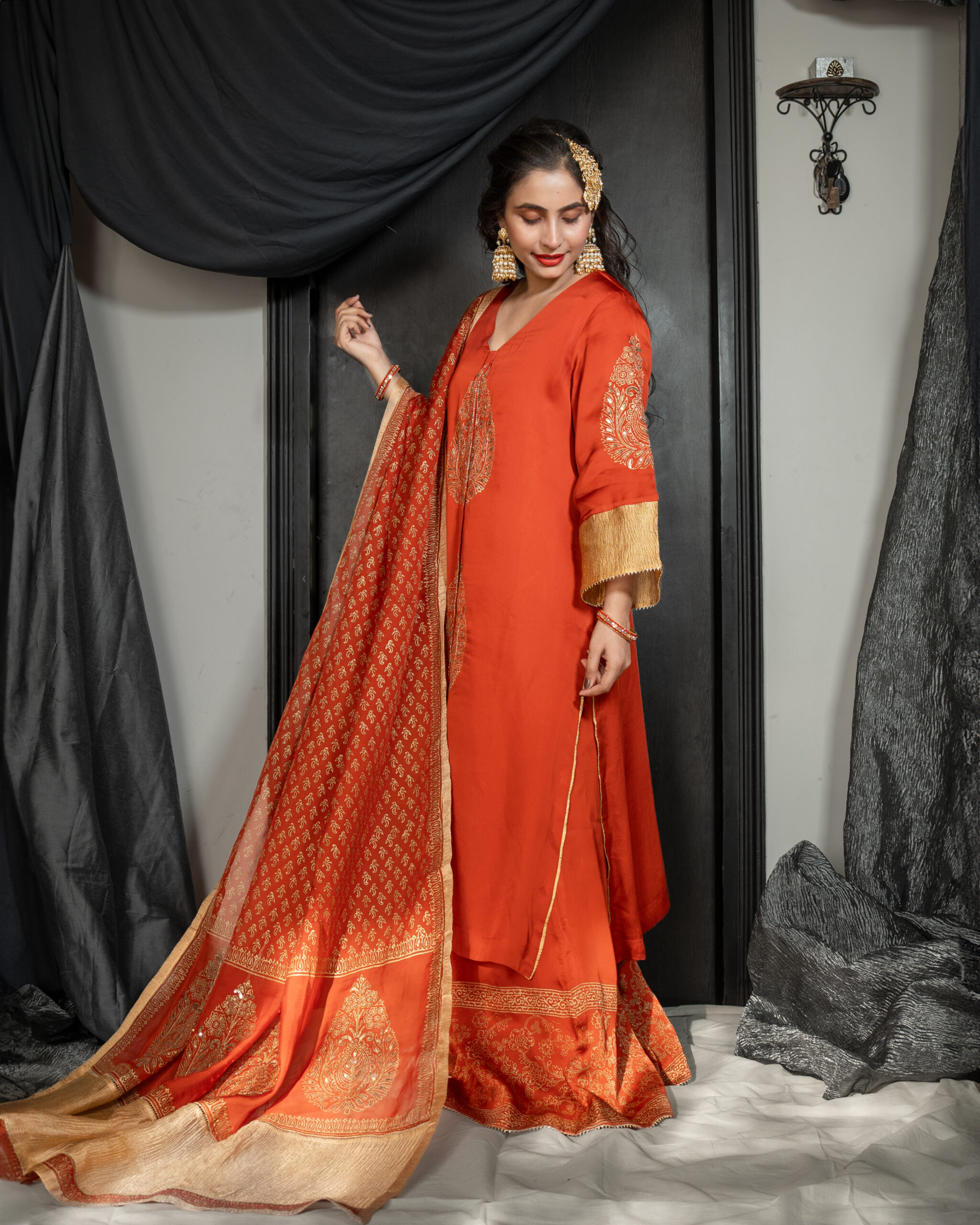 Rust block printed kurta with extravagant tissue organza sleeves , highlighted with hand-embroidered sequins and gota trims