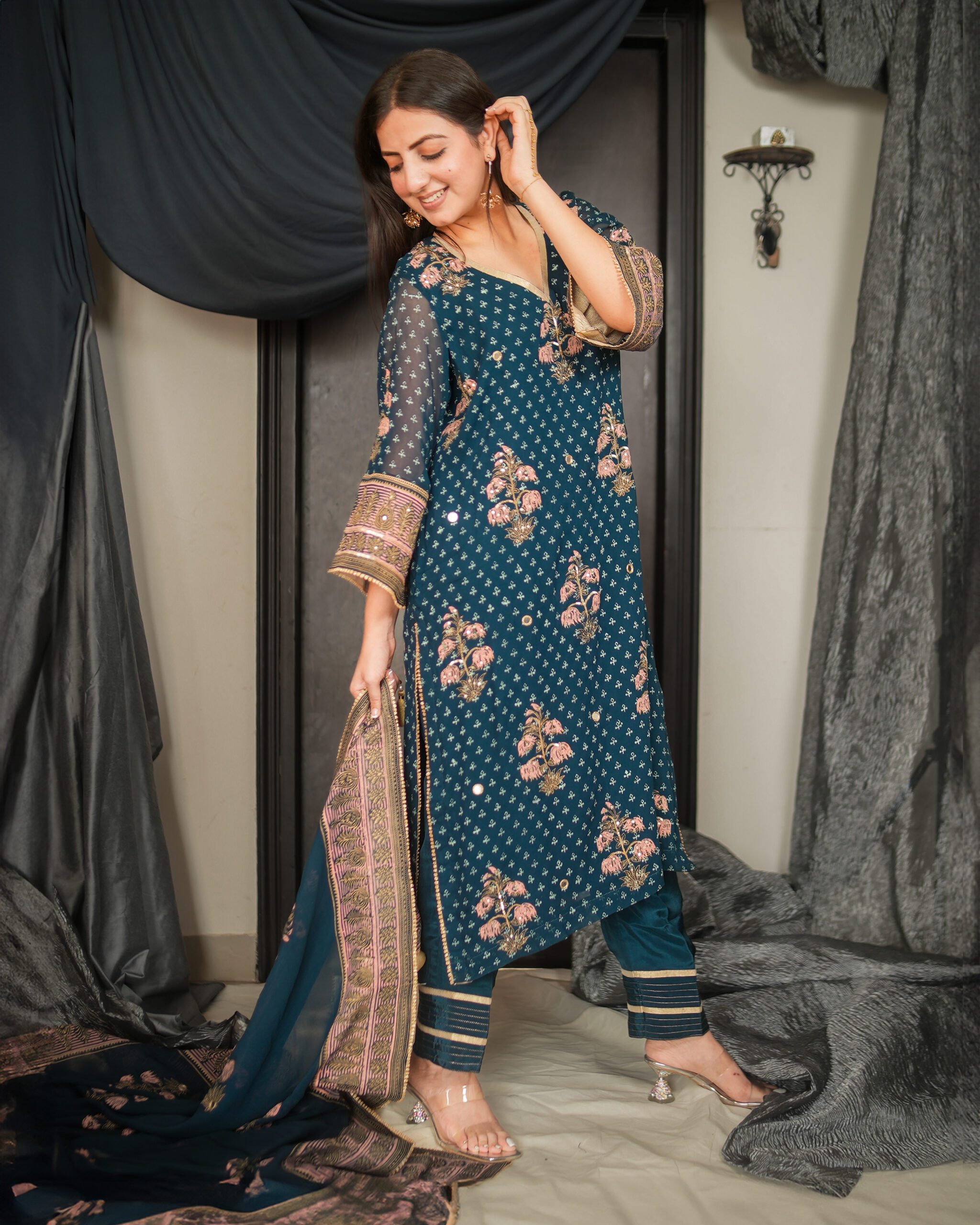 Deep Blue V-Neck kurta with golden block printing and hand-embroidered sequins and mirrors bordered with gota trims
