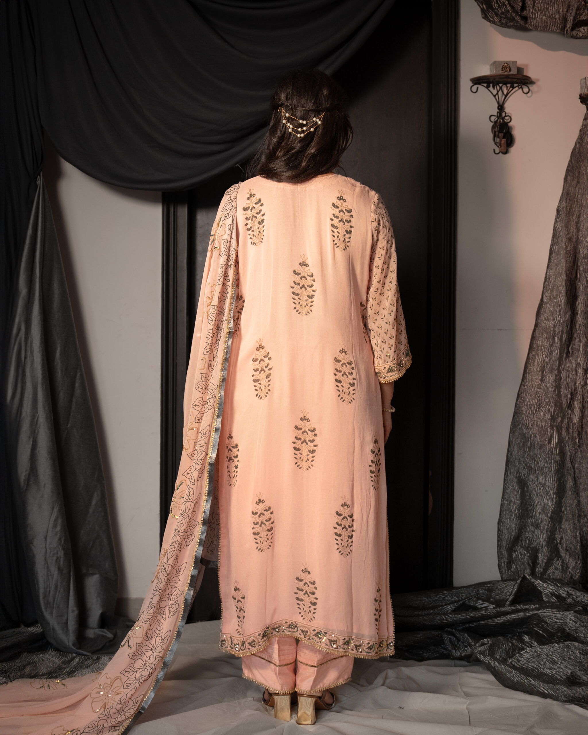 Blush Pink Handcrafted Kurta in Georgette with Mughal inspired Block printing highlighted with hand-embroidered sequins