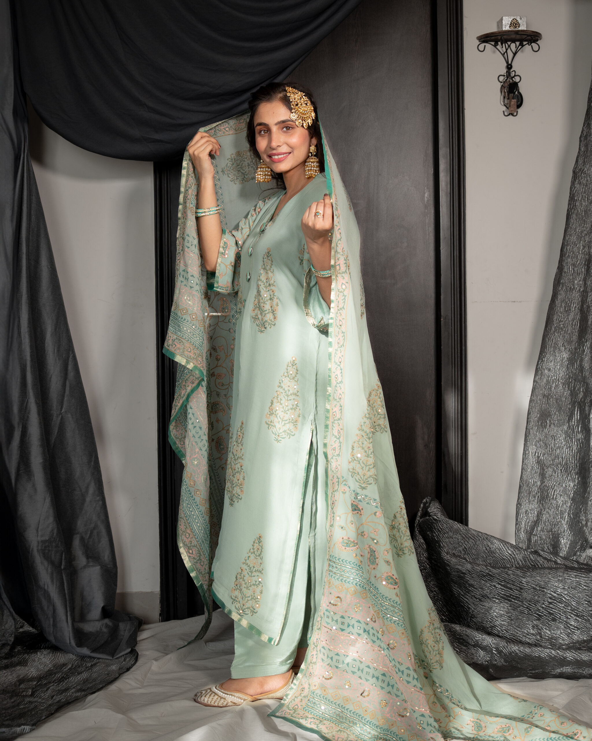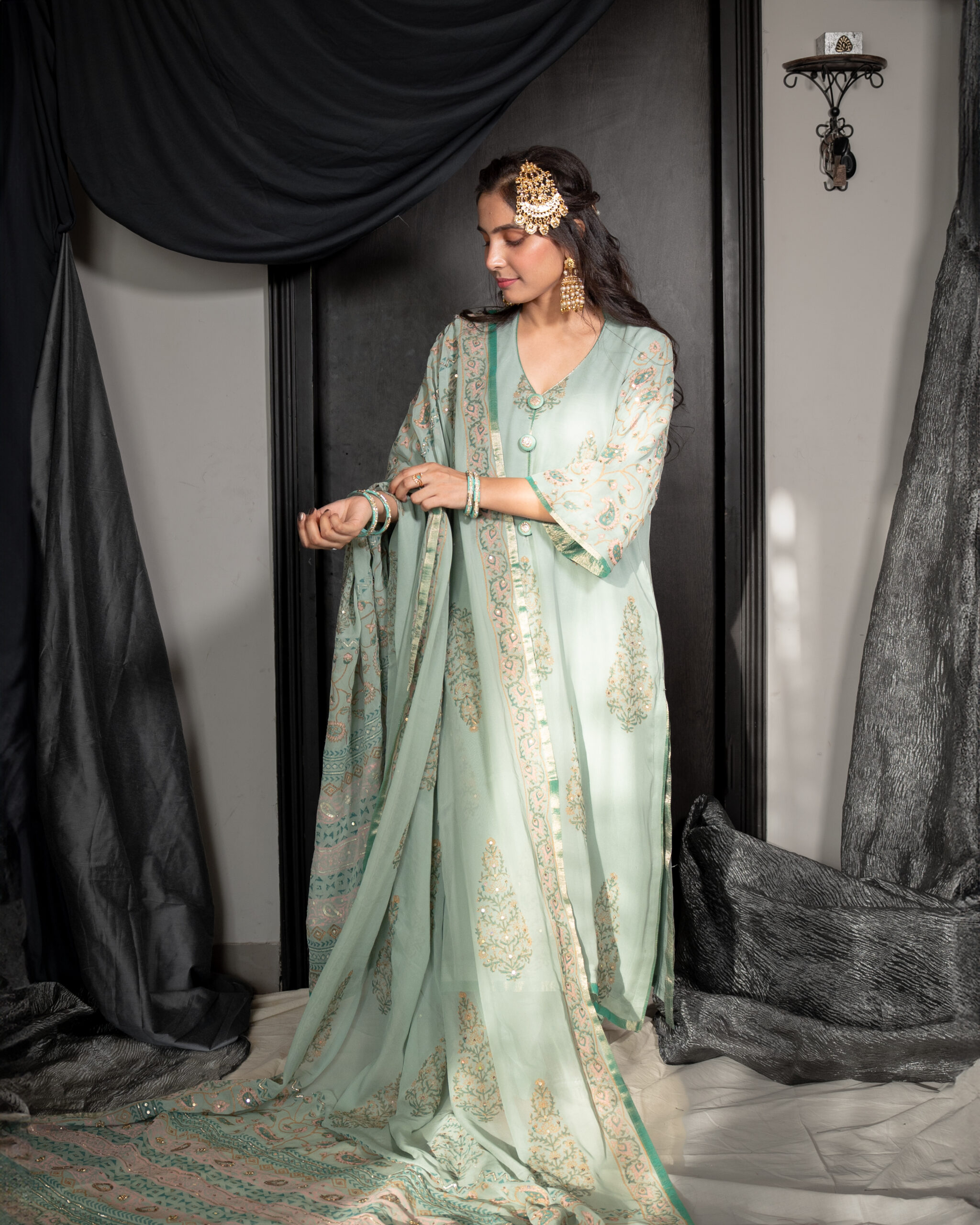 Subtle Pista Green kurta with block printing and hand-embroidered sequins , sleeves adorned with a trim of tissue organza