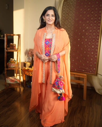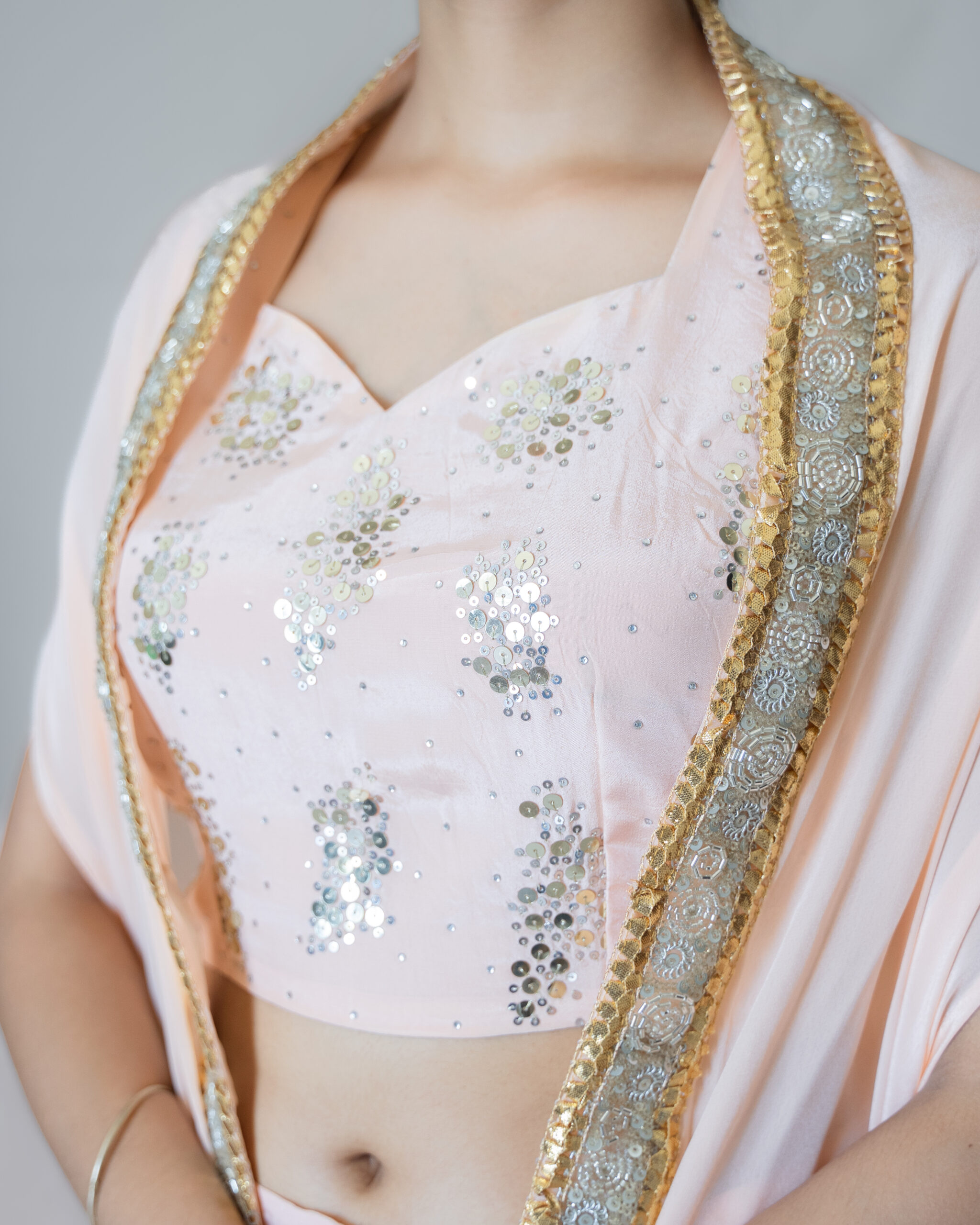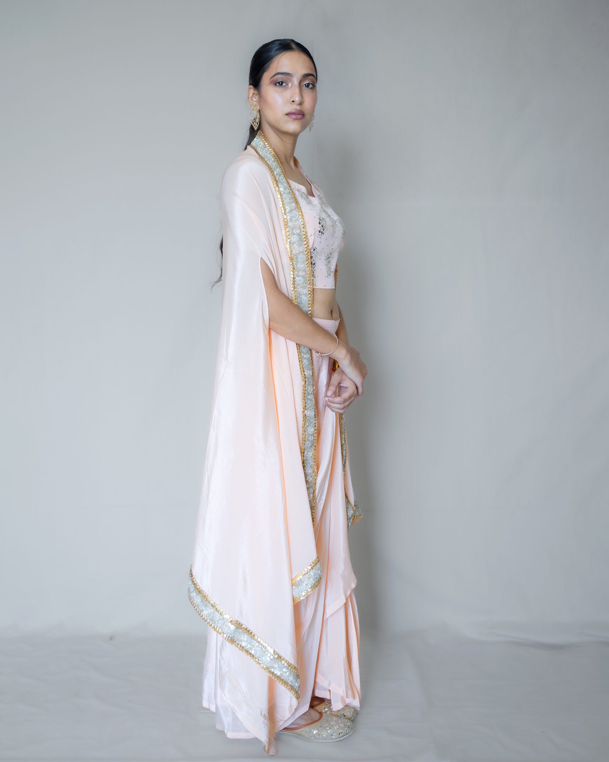 Our Indo-Western pieces are made from high-quality materials, with each embroidery crafted by skilled artisans who value traditional craftsmanship over fast fashion. This trending Light Peach ensemble consists of a Draped Skirt paired with Hand-embroidered sequin work Crop top along with a hand-embroidery detailed Cape.