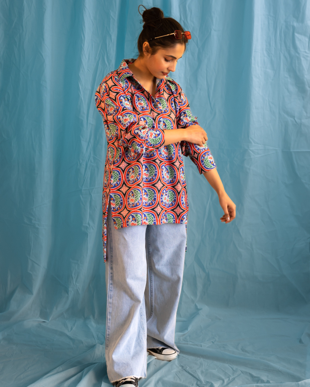 pixelated peacock print collared shirt with high-low hem .Our summer styles are in 100% cotton. Easy to wear and can be machine washed.