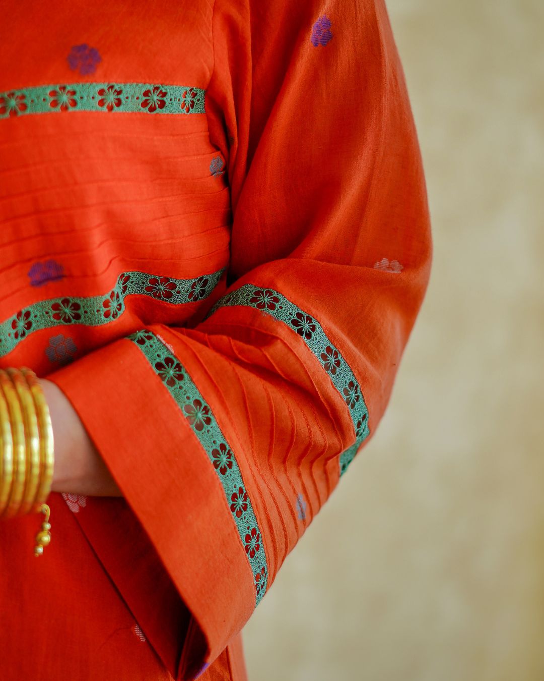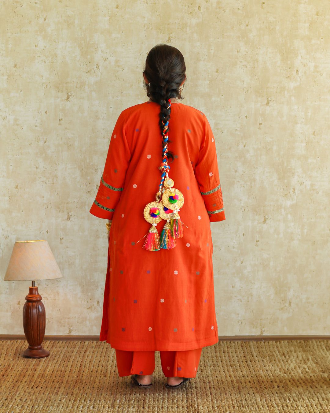 Rust kurta with beautiful lace detailing teamed with palazzo style pants.