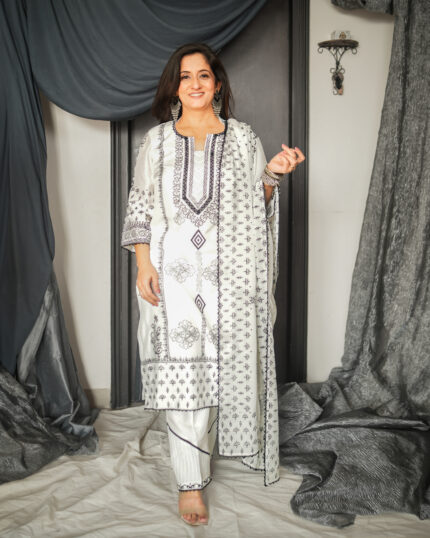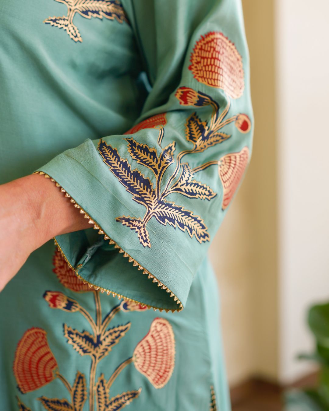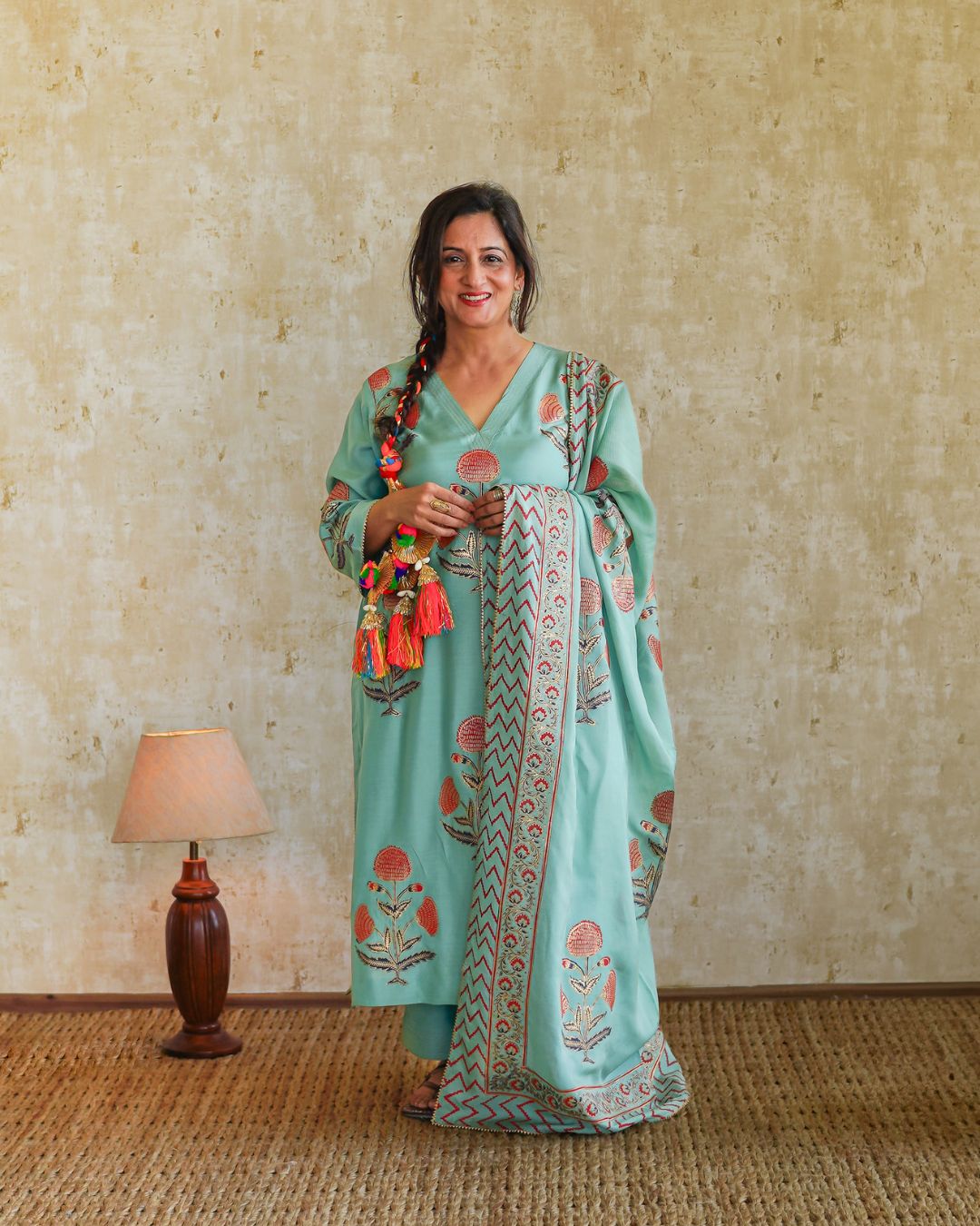 Dusty jade muslin kurta set with a muslin textured dupatta . The kurta and dupatta is hand block printed and teamed with palazzo pants. Customization available same style is also available in crepe.