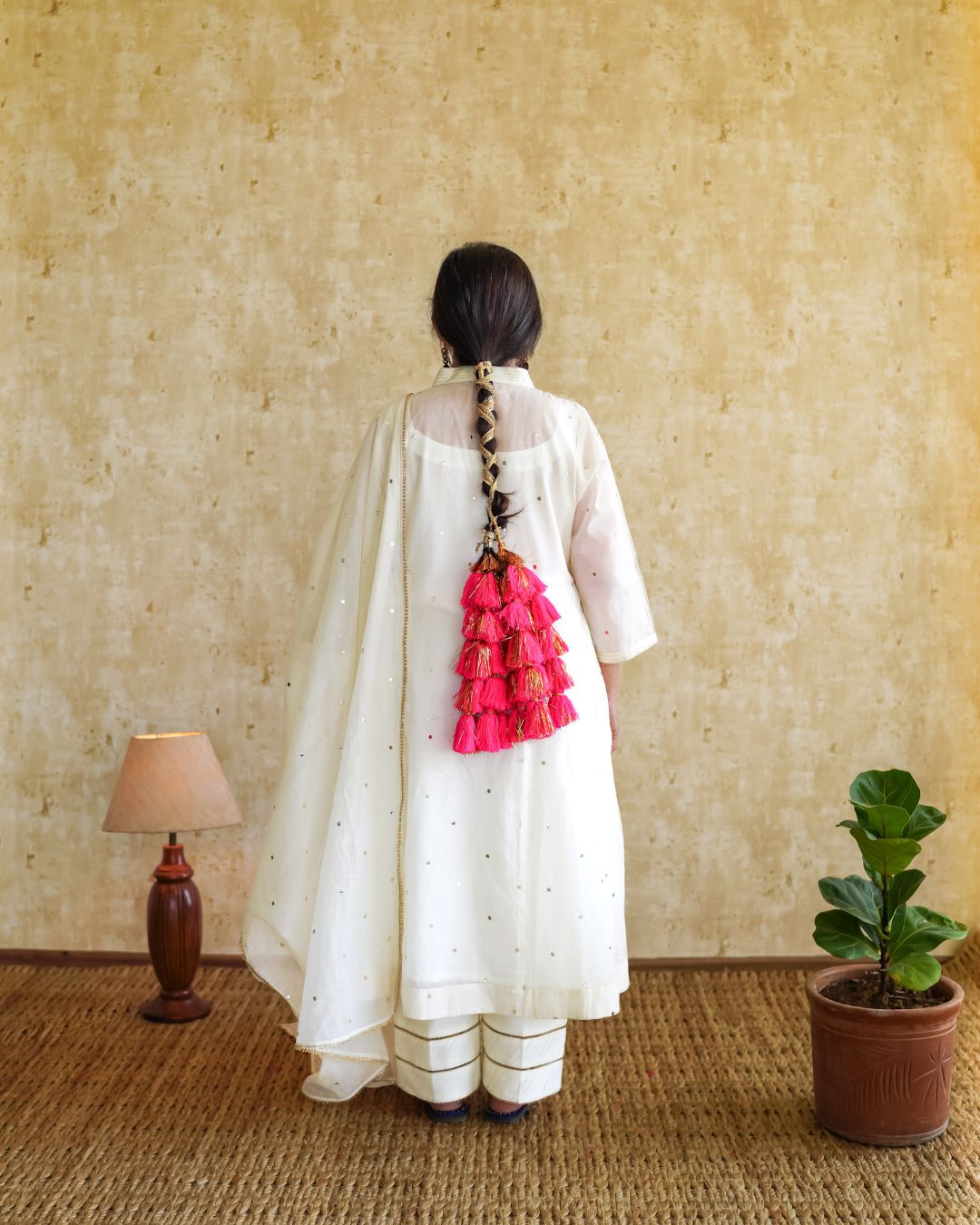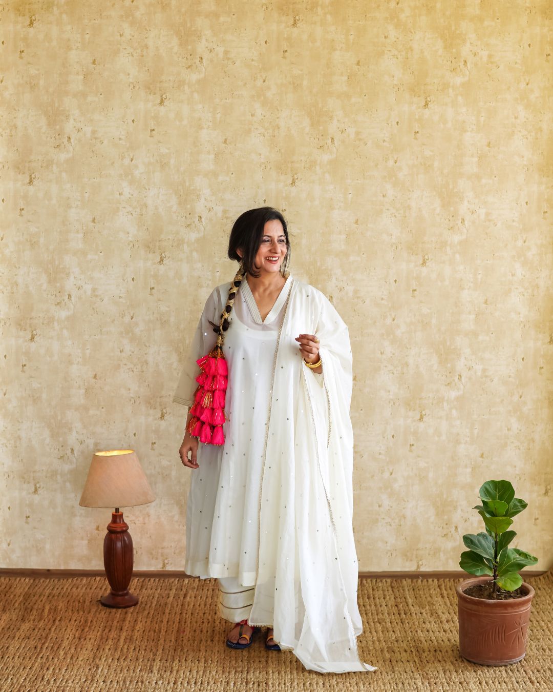Chanderi kurta set with beautiful mirror embroidery allover and on dupatta also.