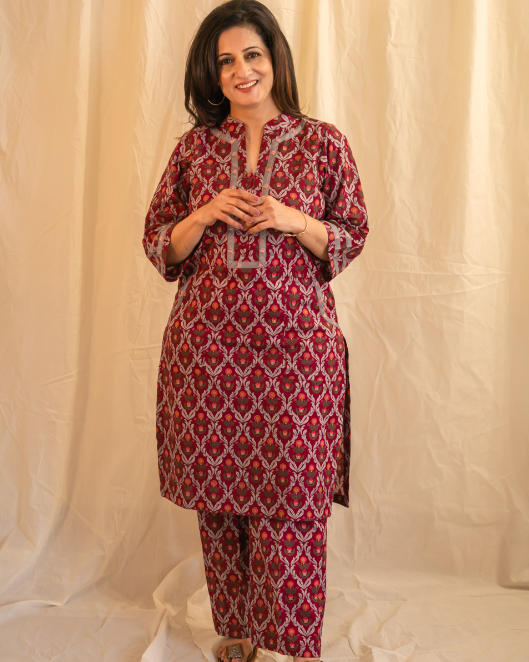 The kurta has a mandarian collar with detailing on the neckline and detailed pockets on the front side paired with a palazzo which makes it comforatable for summers and can be machine washed.