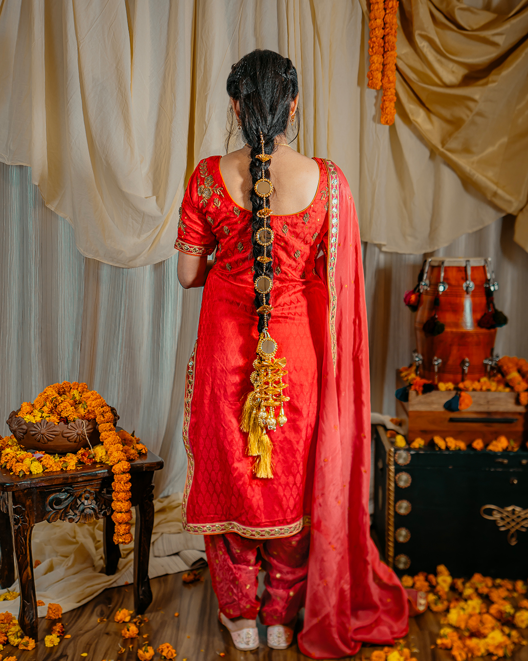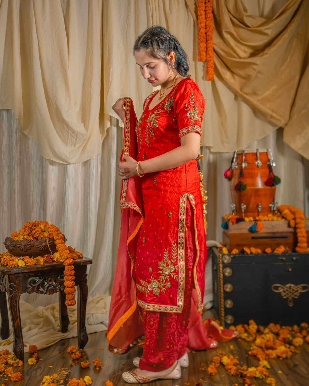 Our Signature pieces are made from high-quality materials, with each embroidery crafted by skilled artisans who value traditional craftsmanship over fast fashion. This ensemble includes a luxurious silk (Tanchoi) in Scarlet red embellished with zardozi embroidery on neck and borders, paired with Banarasi georgette salwar & Chinon gota trimmed dupatta.